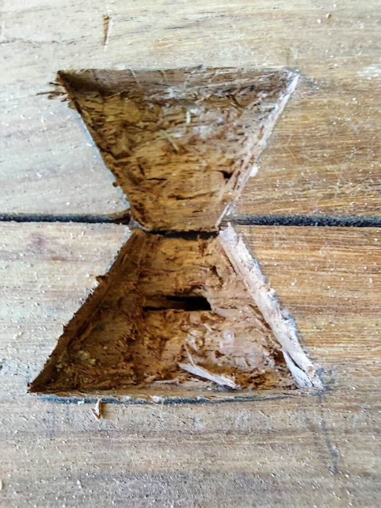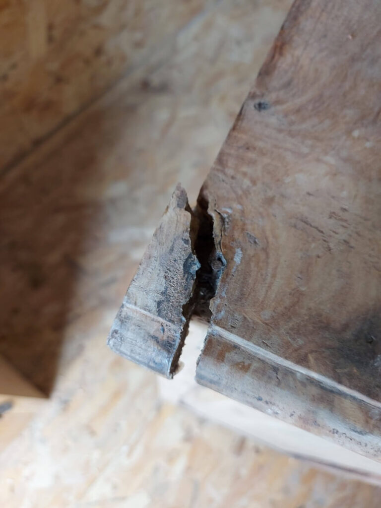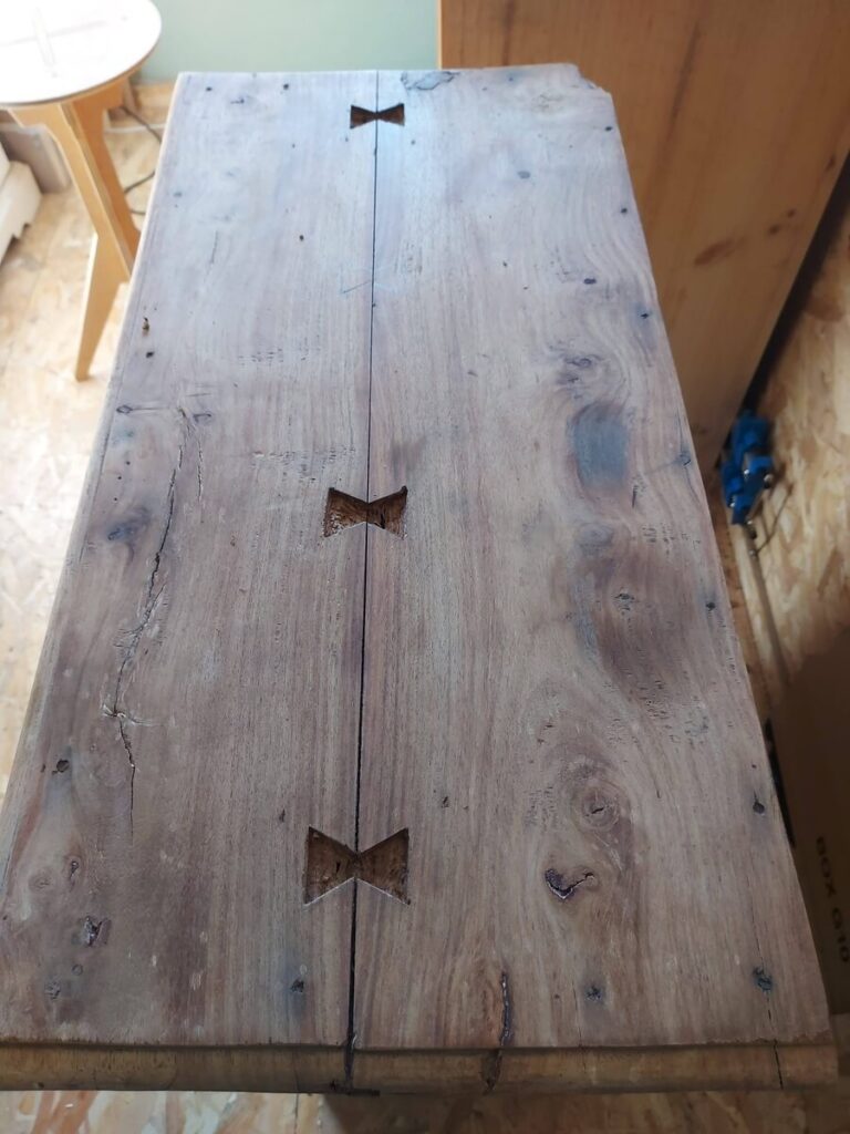 Después de mucho trabajo y lijado empecé a confirmar mi intuición: el mueble estaba hecho con maderas de diferentes tonalidades, parece que es roble con tonos blancos, grises y rojizos. También me di cuenta de que pesaba tanto debido a que la trasera (normalmente un tablero fino de apenas 5 mm) estaba hecha con madera de 20mm. Era un mueble hecho para durar en el tiempo. El sobre tenía separados los tableros y era imposible volverlos a su posición original, por lo que decidí unirlos con unos lazos (de madera recuperada) que a la vez que impidieran que se siguiera abriendo le podrían dar un toque estético diferente.